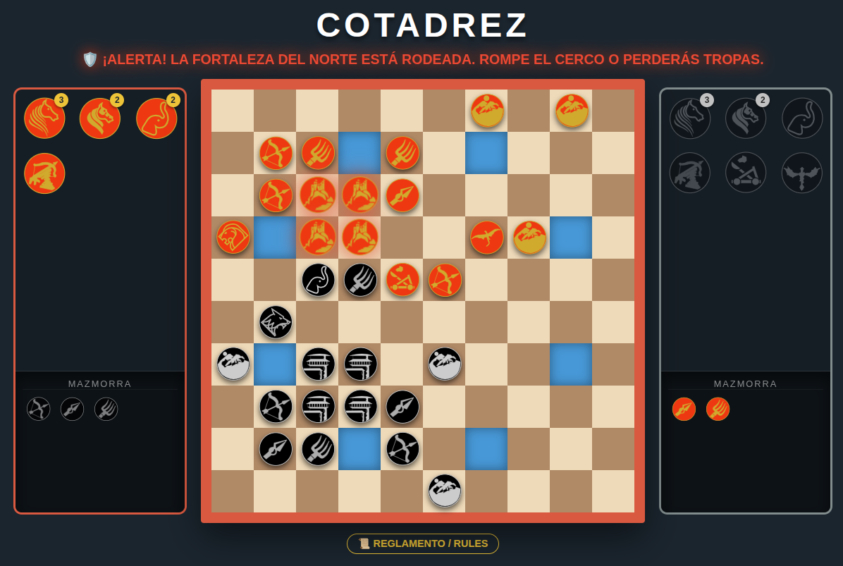 * 🛡️ Caballería Pesada: Mueve en "L" corta (2x1). Puede moverse entre las tropas aliadas pero no atraviesa Montañas, Agua o Fortalezas o casillas ocupadas por el enemigo.